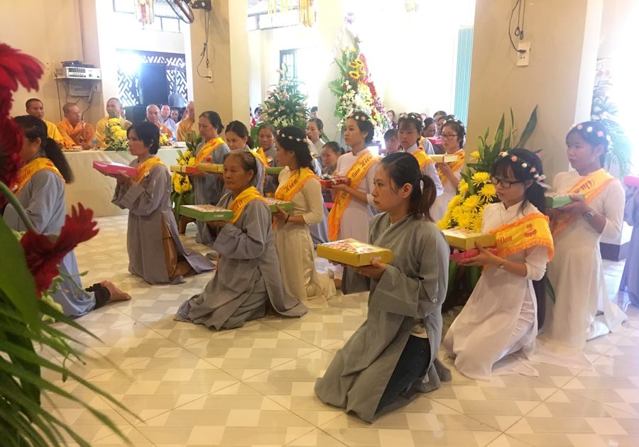 Trong không khí trang nghiêm, hàng Phật tử trang nghiêm nhiễu pháp y, dâng lên cúng dường chư tôn đức. Đải lao chư tôn đức có đôi lời đạo từ với tứ chúng ĐĐ. Thích Chiếu Pháp, Phó ban kiêm Chánh Thư ký BTS GHPGVN tỉnh Bình Phước đã nhắc lại sự lao nhọc của mẹ cha, người con Phật luôn nhớ tứ ân, sống và làm việc luôn có ích cho bốn ân này.