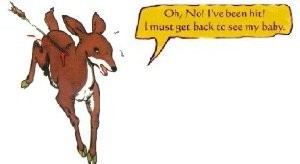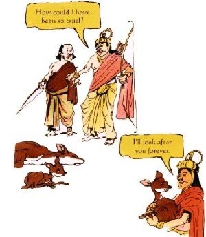 Ông vua bắn một mũi tên và trúng một nai mẹ. Nai mẹ chạy đi trong đau đớn. Sau đó, ông vua thấy nai mẹ trốn trong những bụi cây với nai con. Mặc dù nai mẹ đang bị chảy máu và chảy nước mắt, nhưng nai mẹ vẫn cho nai con bú sữa. Ngay sau đó nai mẹ chết.