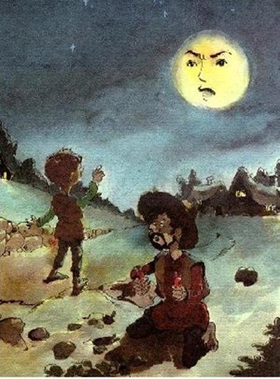 Ngày xưa có một gia đình rất nghèo. Họ thường đi đến vườn nhà hàng xóm để trộm một ít rau quả. Một buổi tối, ông bố dắt theo đứa con trai nhỏ vào vườn nhà hàng xóm để ăn trộm một ít cà rốt. Trong khi ông bố đang nhổ vài củ cà rốt lên, đứa con trai nhỏ của ông đứng bên cạnh ông. Bỗng nhiên, đứa con trai của ông nói thầm, “Bố ơi, có ai đang nhìn chúng mình.” Ông bố chợt sợ hãi. Ông vội vã nhìn xung quanh nhưng ông không thấy một ai. “Ở đâu? Ai vậy?” ông hỏi. Người con chỉ lên bầu trời, “Đó, Bố ơi. Đó là mặt trăng. Mặt trăng đang nhìn chúng mình.”