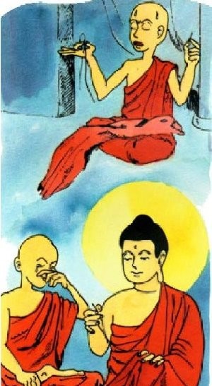 Đức Phật đi tới căn phòng của anh để xâu kim cho anh. "Ai đang xâu kim hộ tôi đó?” Anuruddha hỏi. “Phật Đà đấy.” Đức Phật trả lời trong khi ngài đang vá cái áo choàng. Anuruddha cảm thấy