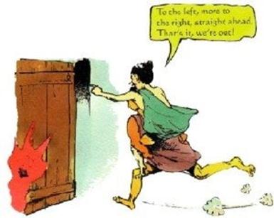 Họ quyết định giúp đỡ lẫn nhau. Người bị mù cõng người bị què trên lưng anh ta. Người què nói cho người mù biết phải đi lối nào. Cùng nhau, họ ra khỏi được ngôi nhà đang bốc cháy.