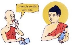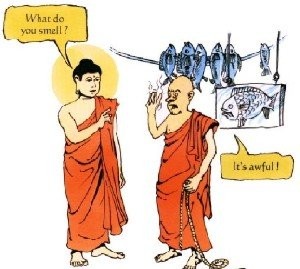 Đức Phật và Ananda đang đi khất thực trong một thành phố. Họ đi ngang một cửa hàng bán cá. Đức Phật nói, “Ananda, con hãy sờ vào cái dây đang treo cá rồi ngửi những ngón tay con.”