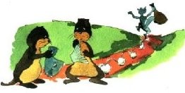 Vợ của một con cáo muốn ăn một ít cá tươi. Con cáo cố kiếm tìm một ít cá cho vợ ở gần dòng sống. Cáo nhìn thấy hai con rái cá ở bên sông đang kéo lê theo một con cá to. Cả hai đều muốn đòi những phần cá tốt nhất.