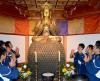 SEKI, Gifu Prefecture - Các túc cầu bóng bầu dục và người hâm mộ đến ngôi Già lam Phật địa để cầu nguyện trước tôn tượng Phật cổ 5 thế kỷ có tư thế bàn tay Thủ ấn giống như của anh hùng đội tuyển quốc gia Ayumu Goromaru.