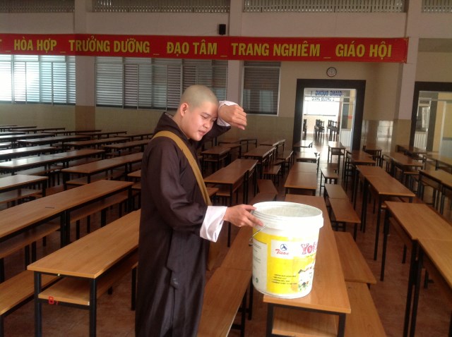 Tăng sinh Huệ Thuận là người phát tâm làm công việc thu gom rác tại trường Trung Cấp Phật Học TP. HCM một cách thầm lặng. Thiết nghĩ, trường học không thiếu lao công, nhưng xét về góc độ tự giác làm những việc thiện tí hon thì ít ai làm được.