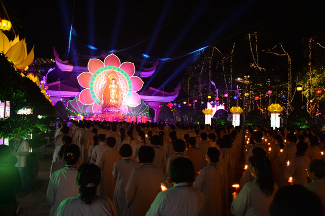 Thời khắc quan trọng của buổi lễ cuối cùng cũng đã đến, trong không khí thiêng liêng và trầm mặc, Hòa thượng Thích Minh Thông, đã tiếp lửa từ ban thờ Đức Phật A Di Đà, truyền lửa đến chư tôn thiền đức, cử chỉ ấy thể hiện sự truyền đăng tục diệm, chánh pháp rạng ngời. Thượng tọa Thích Chân Tính đã tiếp nhận ngọn lửa thiêng và đem ánh sáng ấy truyền đến cho hàng Phật tử. Hành động này như một nghĩa cử cao đẹp thể hiện sự lưu truyền hoằng dương Phật pháp. Thế rồi trong sân lễ, những ngọn nến được truyền sang cho nhau như san sẻ tình thương yêu và sự hiểu biết. Cả một vùng trời lung linh tỏa sáng, đó là ánh sáng chân lý, của niềm tin, của từ bi và trí tuệ, thanh tịnh và hòa hợp. Hình ảnh trang nghiêm và màu nhiệm ấy được các camera ghi lại và truyền đến các màn hình led được bố trí khắp nơi trong nội tự để mọi người đến tham dự trong đêm hội đều được tận hưởng.