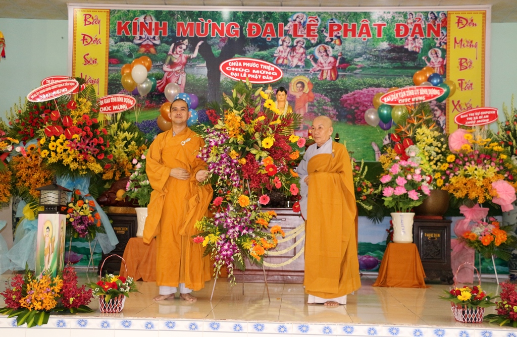 Nối tiếp chương trình, Chư Tôn đức chứng minh, Chư Tôn đức BTS các huyện, thị, thành và quý quan khách đã tặng hoa chúc mừng BTS GHPGVN thị xã Bến Cát nhân dịp Đại lễ Phật đản.