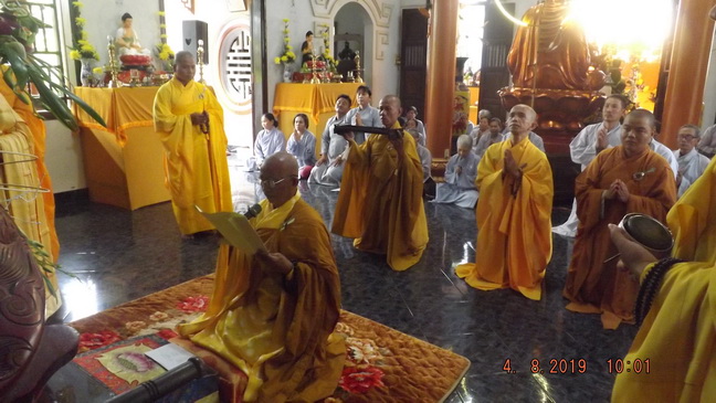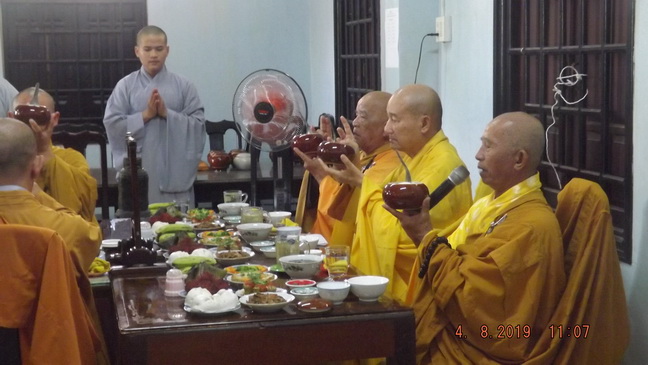 Buổi sáng, sau nghi thức niêm hương bạch Phật và khóa lễ cầu an, chư tôn đức Tăng và Phật tử bổn tự đã thiết lễ Trai diên cúng dường hồi hướng công đức cho cửu huyền thất tổ.